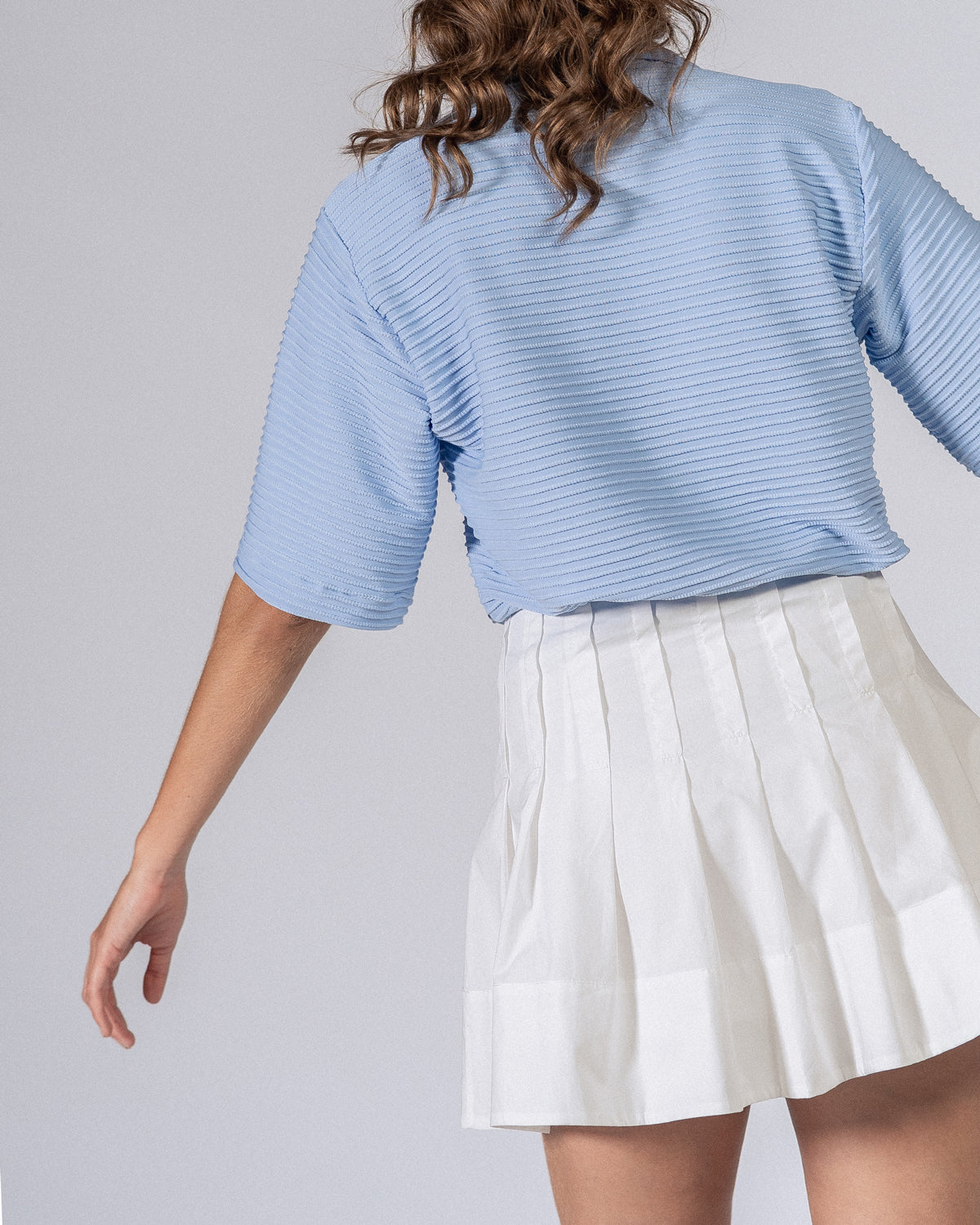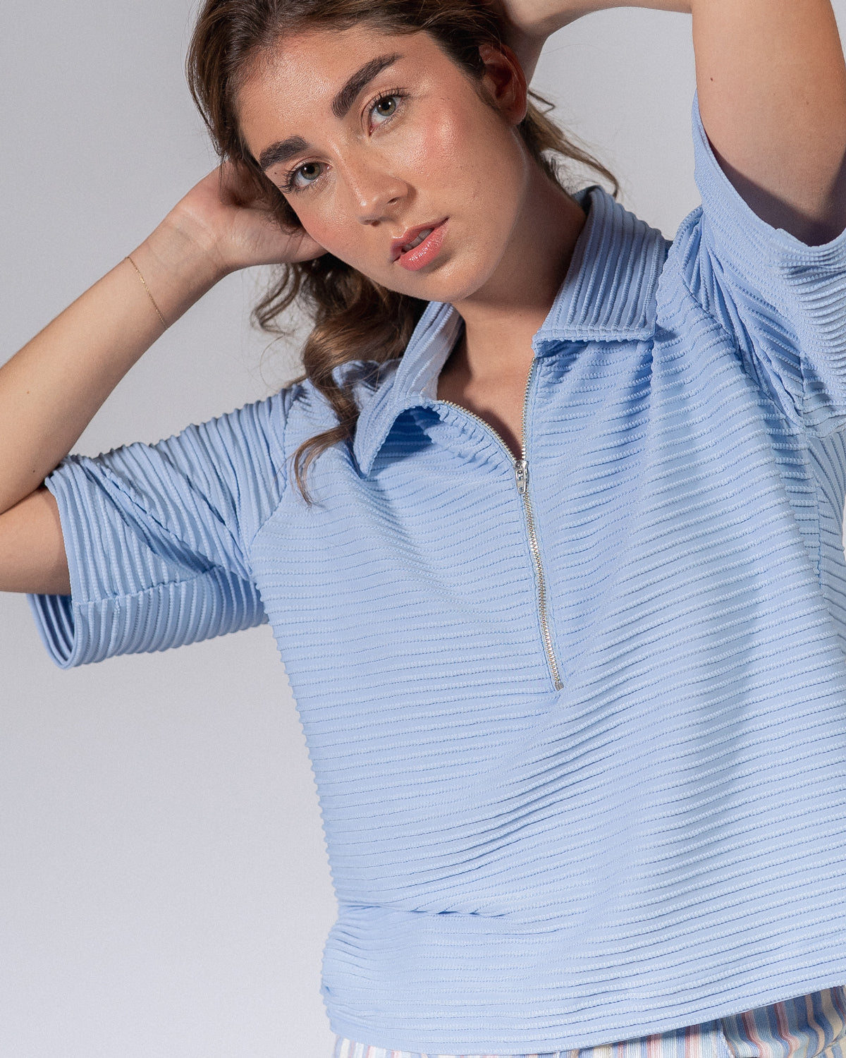 Su silueta clásica, manga corta y una cremallera frontal discreta la hacen el top perfecto para equilibrar tus looks.