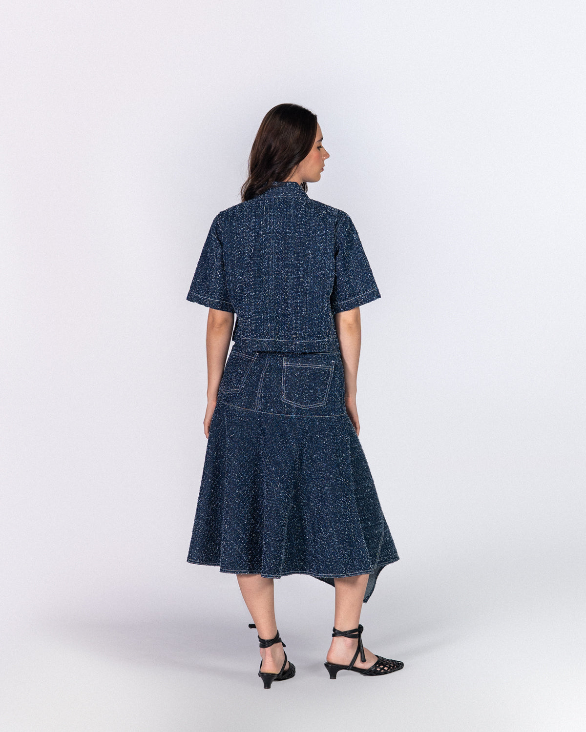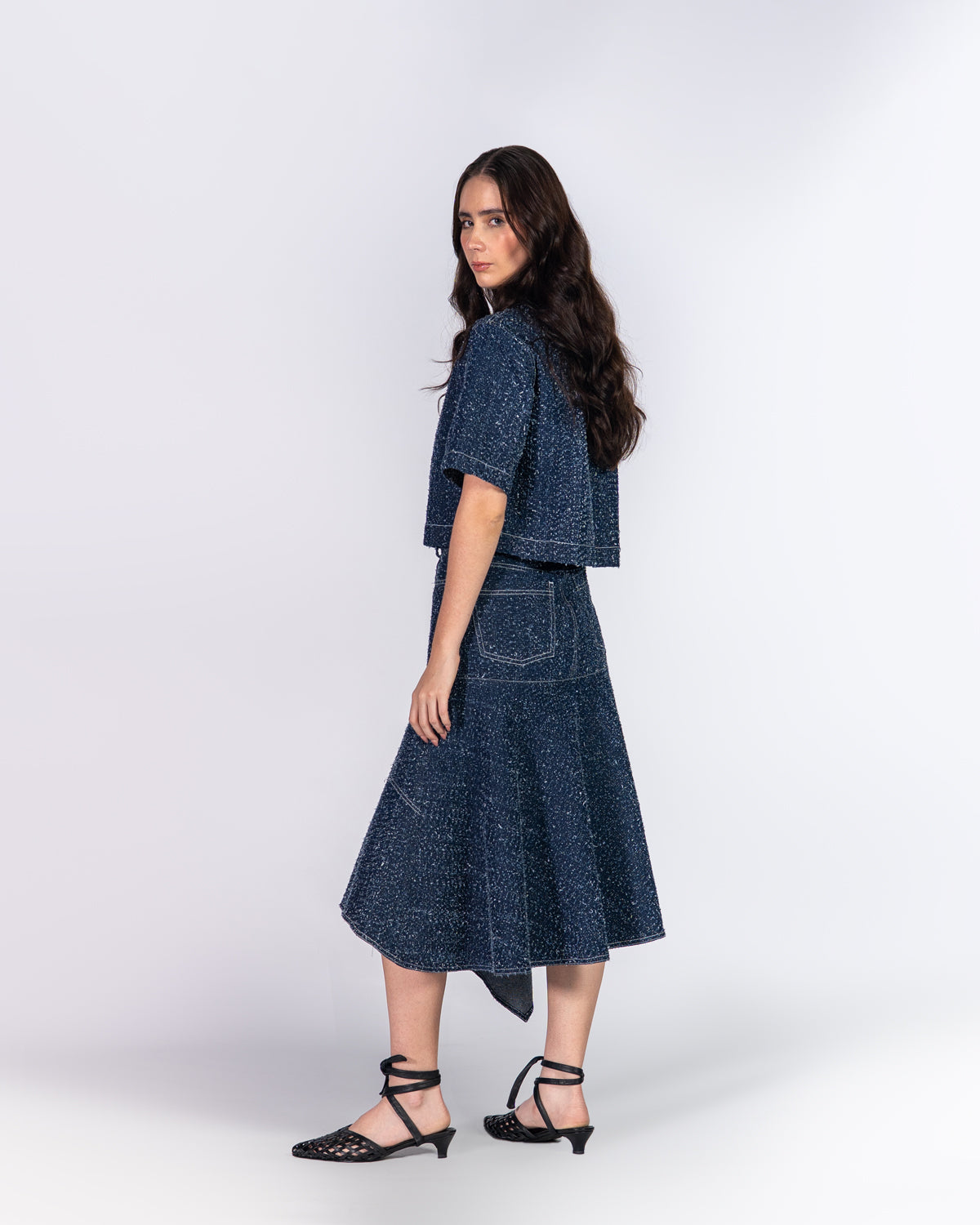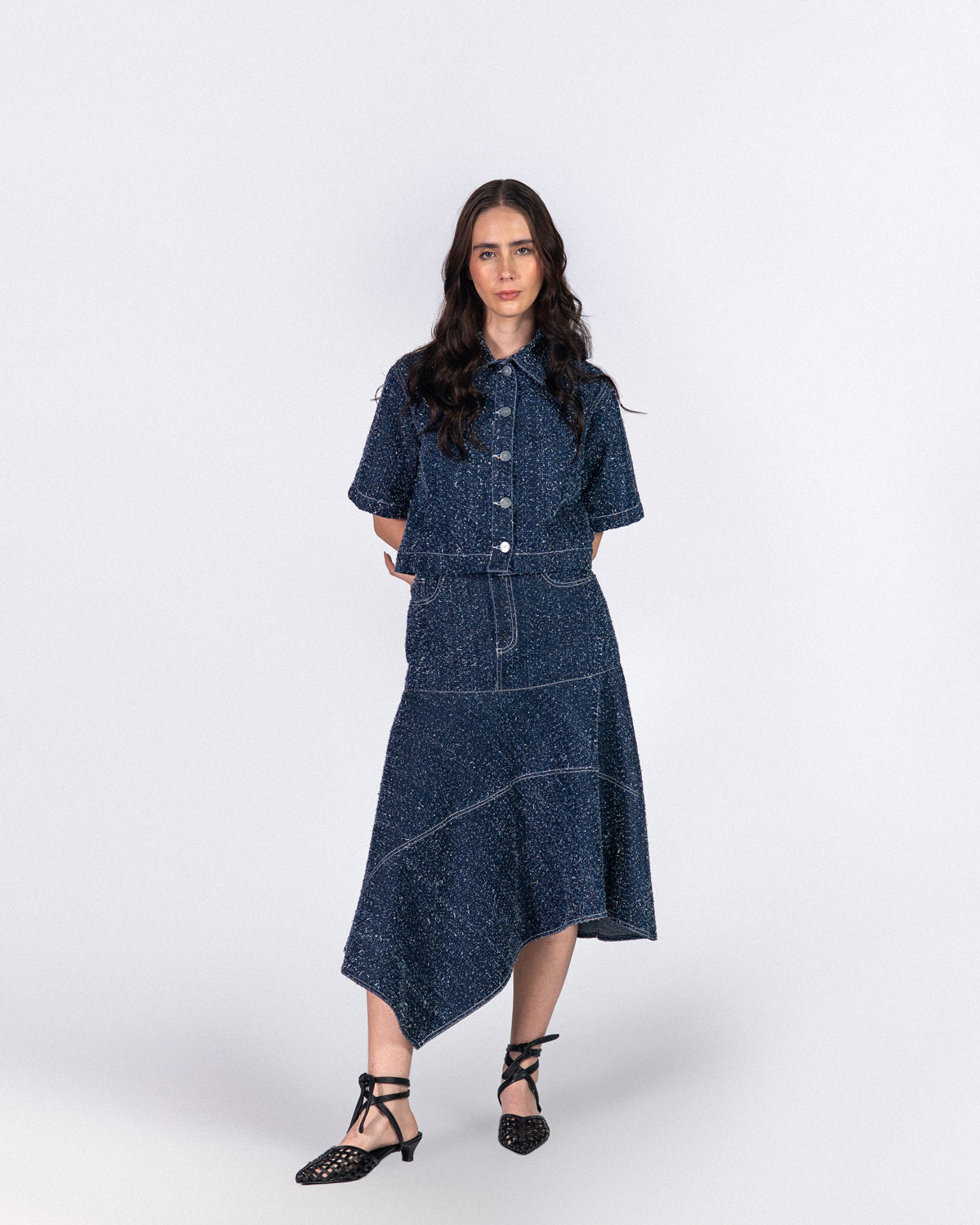 Nuestra Falda Frosty destaca por su denim con textura y ese acabado tipo frost que la hace diferente sin complicarse. Es una falda midi con cortes asimétricos que le dan un look moderno y original, manteniendo la comodidad que necesitas en cualquier momento del día. Tiene cremallera y botón delanteros. Perfecta para llevar en set con el Top Frosty o combinarla con básicos.