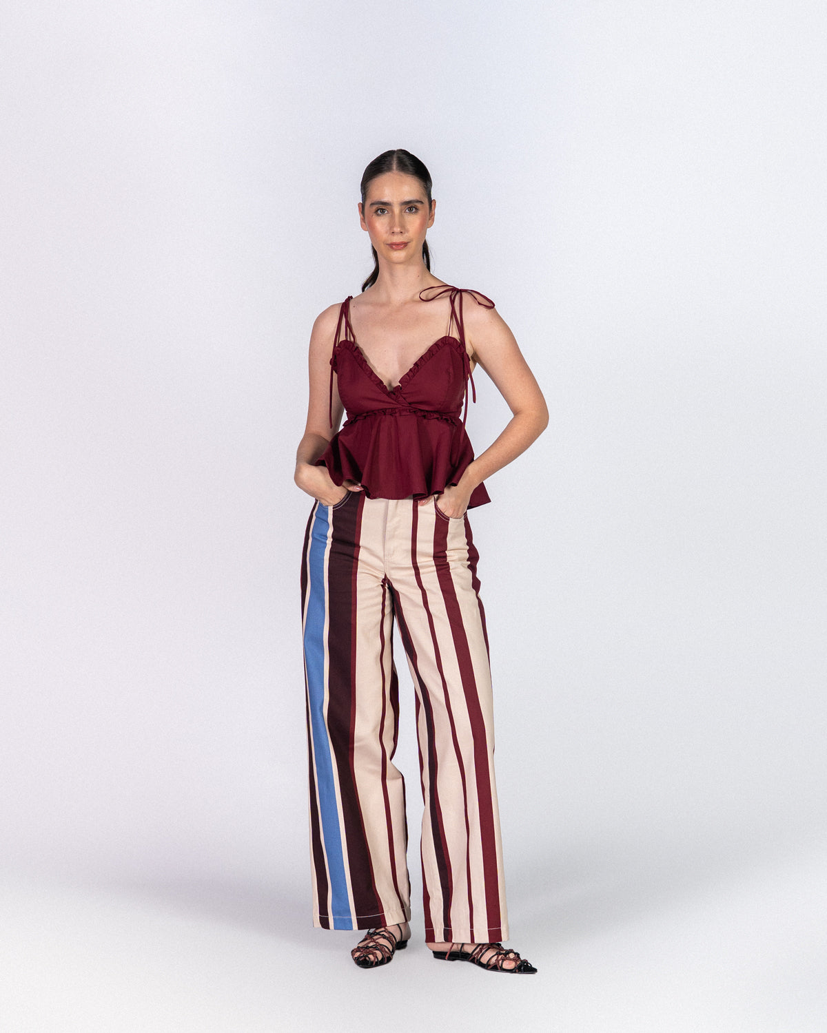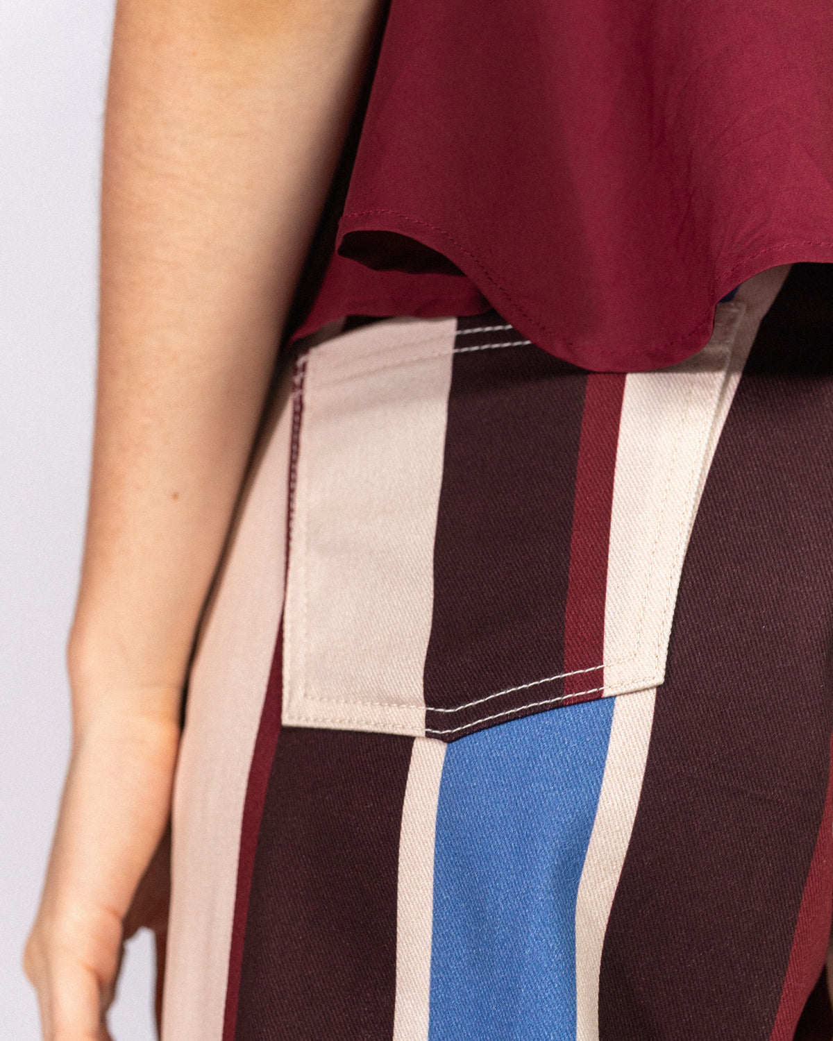 Nuestro Jean Block en una paleta de vino y azul destaca por su print en líneas y su combinación de color. En denim ligero, se siente cómodo y fácil de llevar. De tiro alto y silueta straight, tiene bolsillos adelante y atrás, cierre con cremallera y botón. La ubicación de las líneas puede variar en cada pantalón, por lo que cada pieza tiene un patrón único. Un jean que arma el look sin esfuerzo.