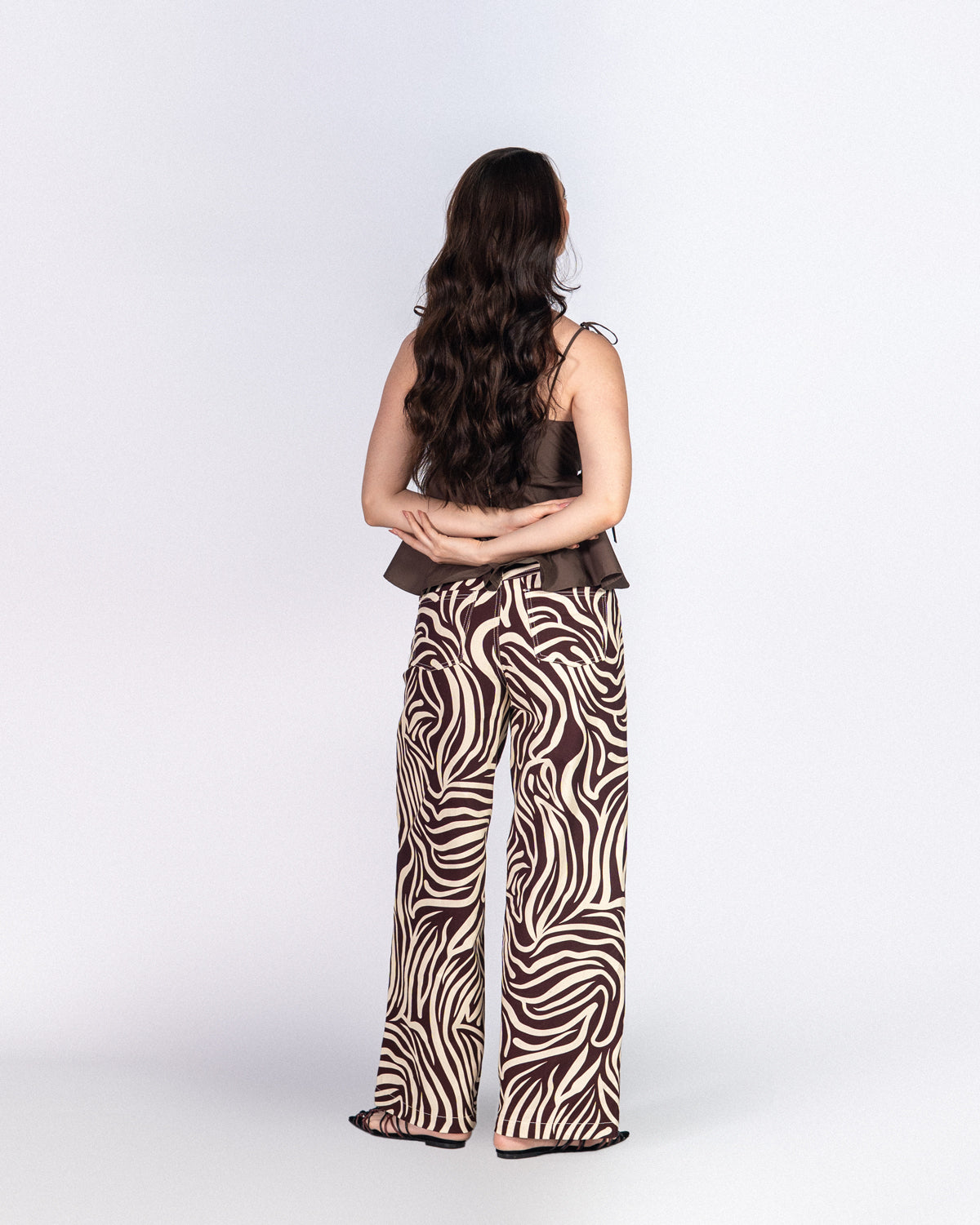 Nuestro Jean Shade se destaca por su print tipo zebra y su fit relajado: un statement piece que arma el look sin pensarlo tanto. En denim ligero, se siente cómodo y fácil de llevar. De tiro alto y silueta straight, tiene bolsillos adelante y atrás, cierre con cremallera y botón.