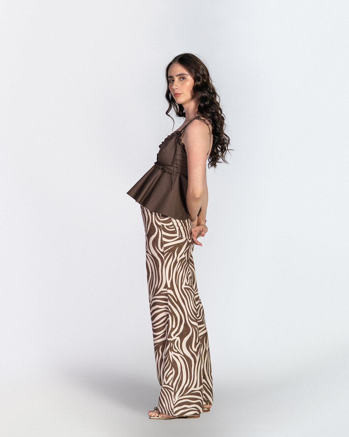 Nuestro Pantalón Shade se destaca por su print tipo zebra y su fit relajado: un statement piece que arma el look sin pensarlo tanto. Está hecho en pana ligera, así que se siente cómodo y fácil de llevar. De tiro alto y silueta straight, tiene bolsillos adelante y atrás, cierre con cremallera y botón.