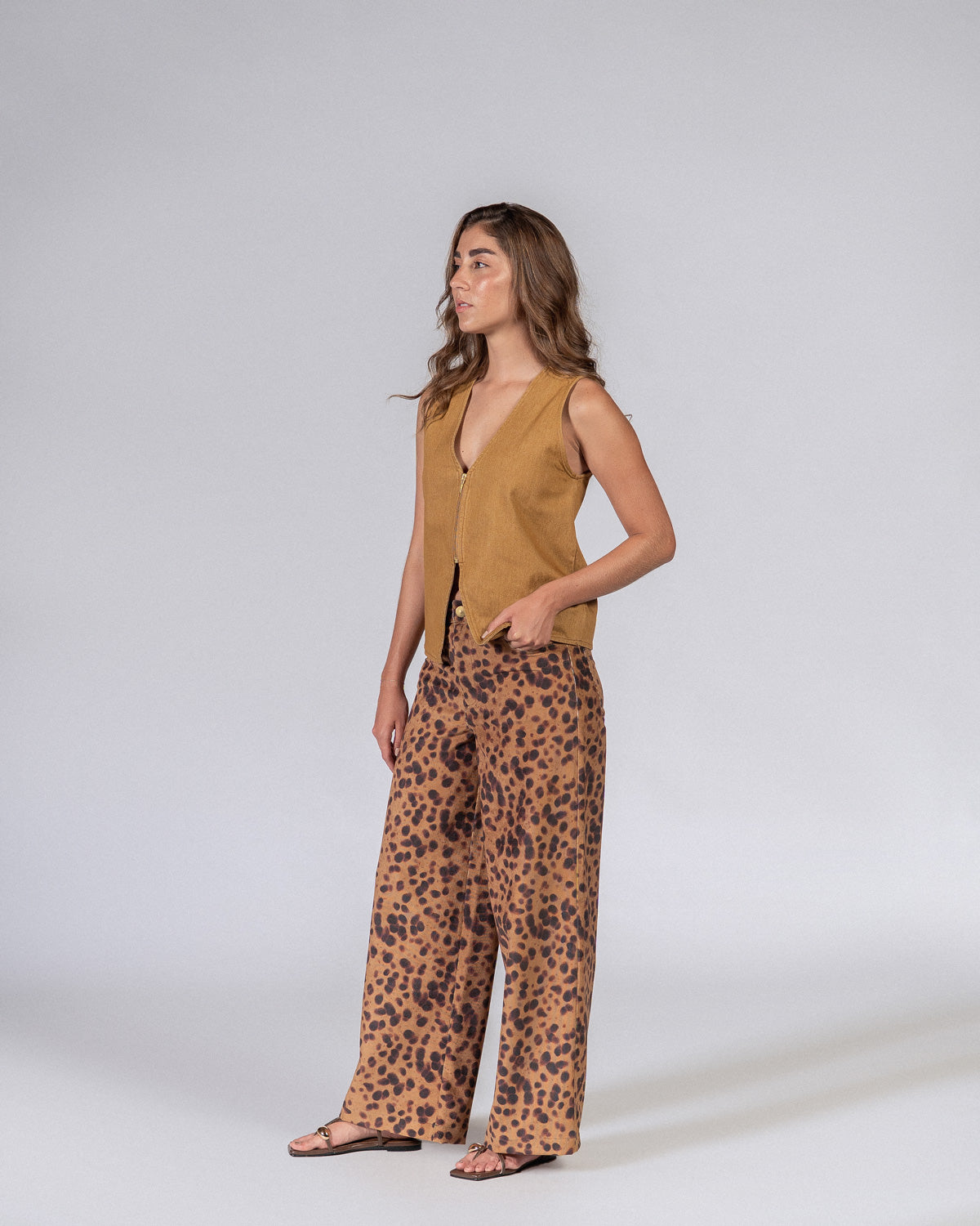 Nuestro Pantalón Siena destaca por su estampado que se asemeja al carey, sofisticado y atemporal. La textura de la tela tipo pana, muy suave, con caída. Y su fit relajado. De tiro alto y silueta wide leg, es cómodo y fácil de llevar. Tiene bolsillos en el delantero y la espalda, cremallera y botón. Haz match con el Top Ocre y arma el set completo.