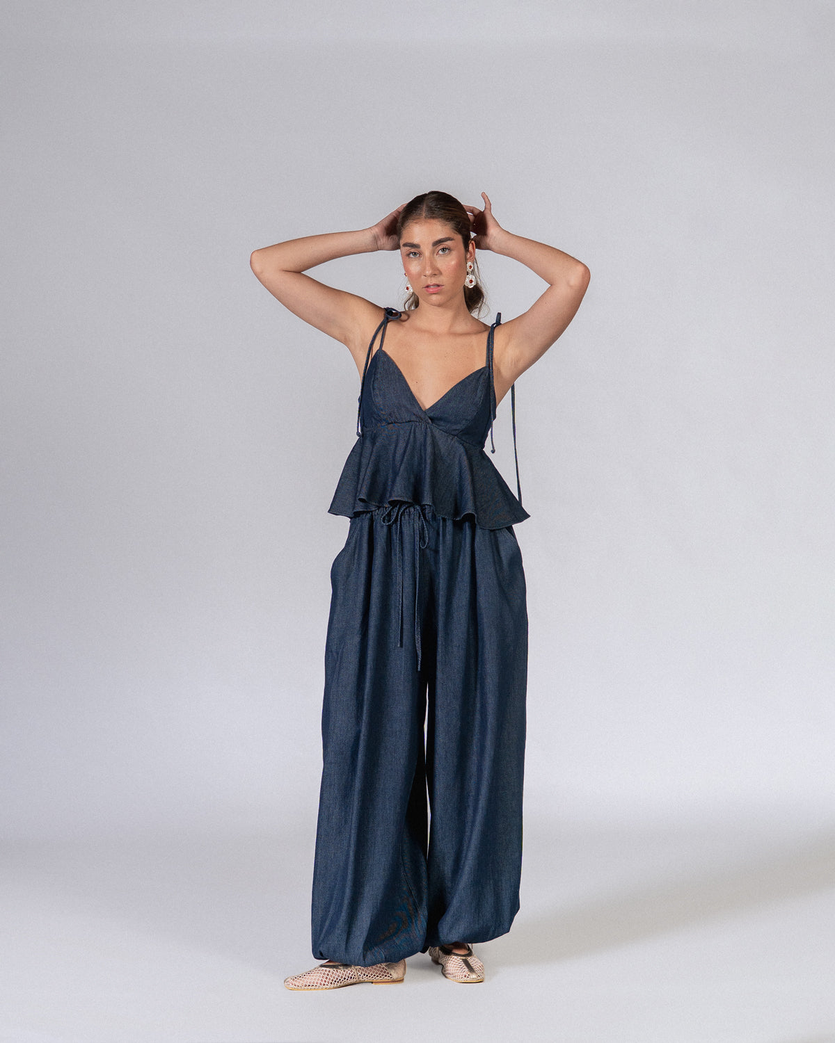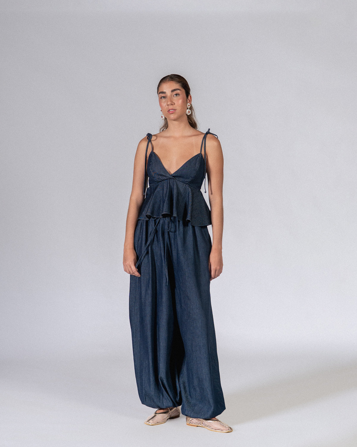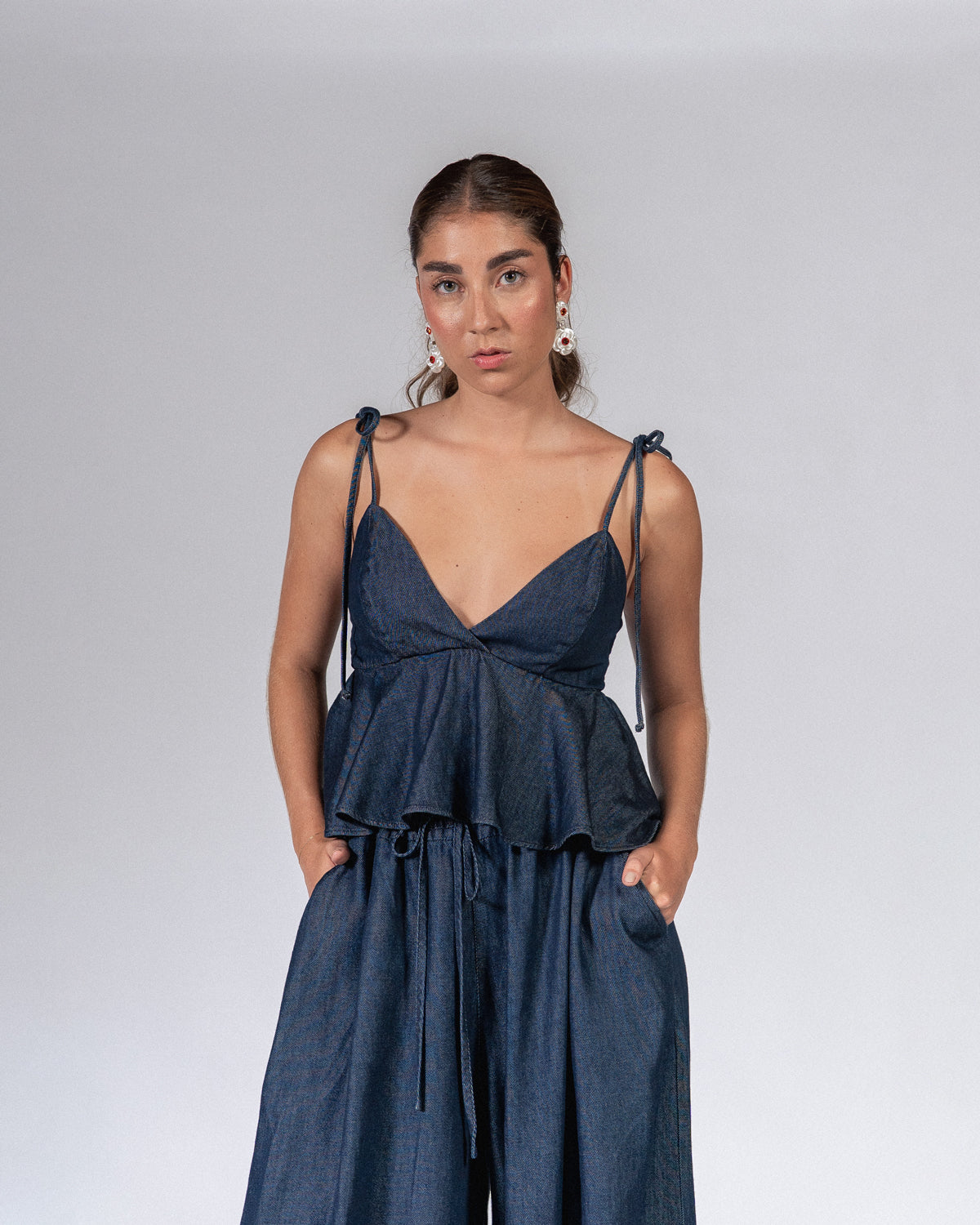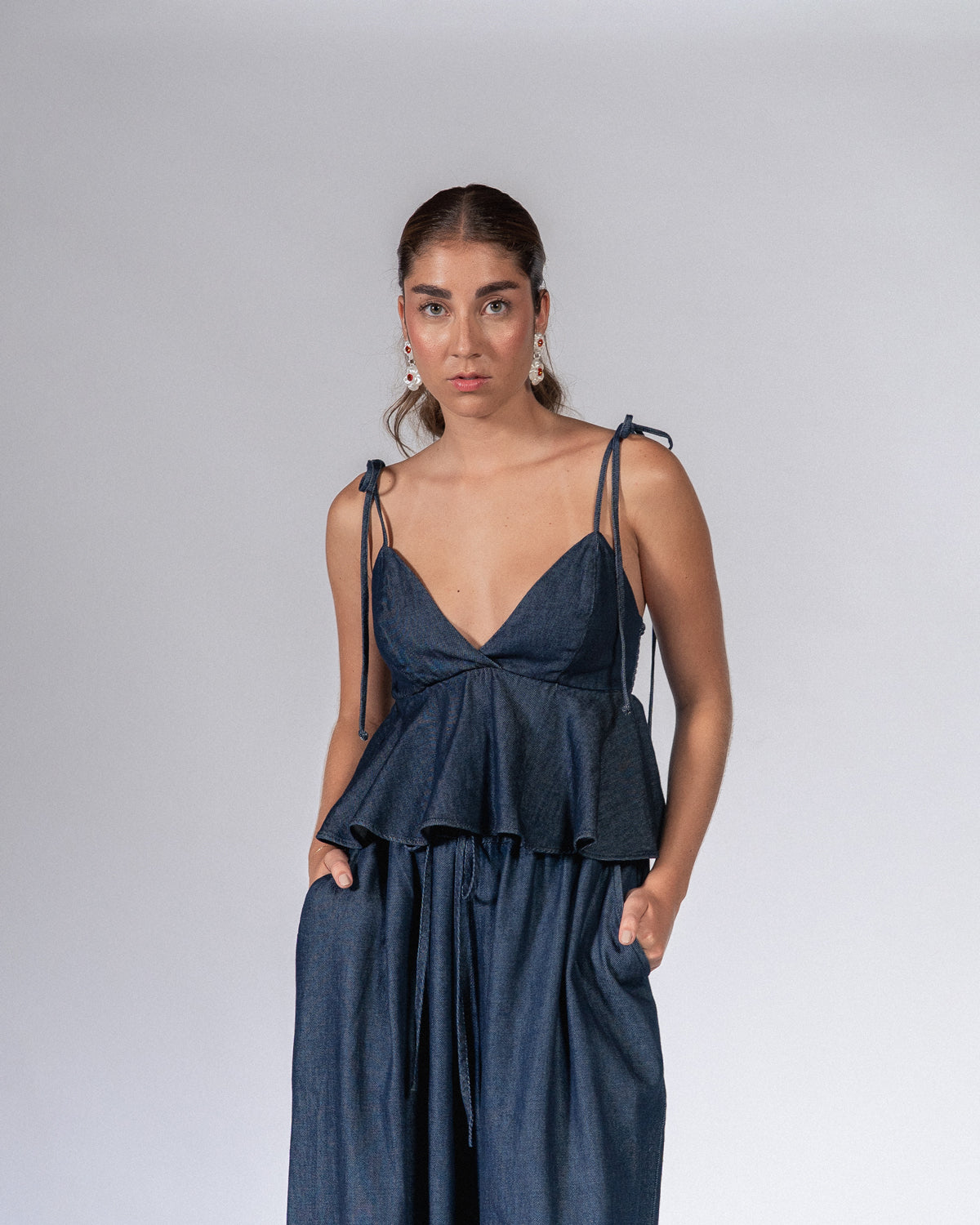 Nuestro Top Praga en tono índigo es una apuesta segura para elevar tu look. Con escote profundo, elástico en la espalda, cremallera, tiras ajustables y silueta peplum. Haz el match perfecto con el pantalón Praga.